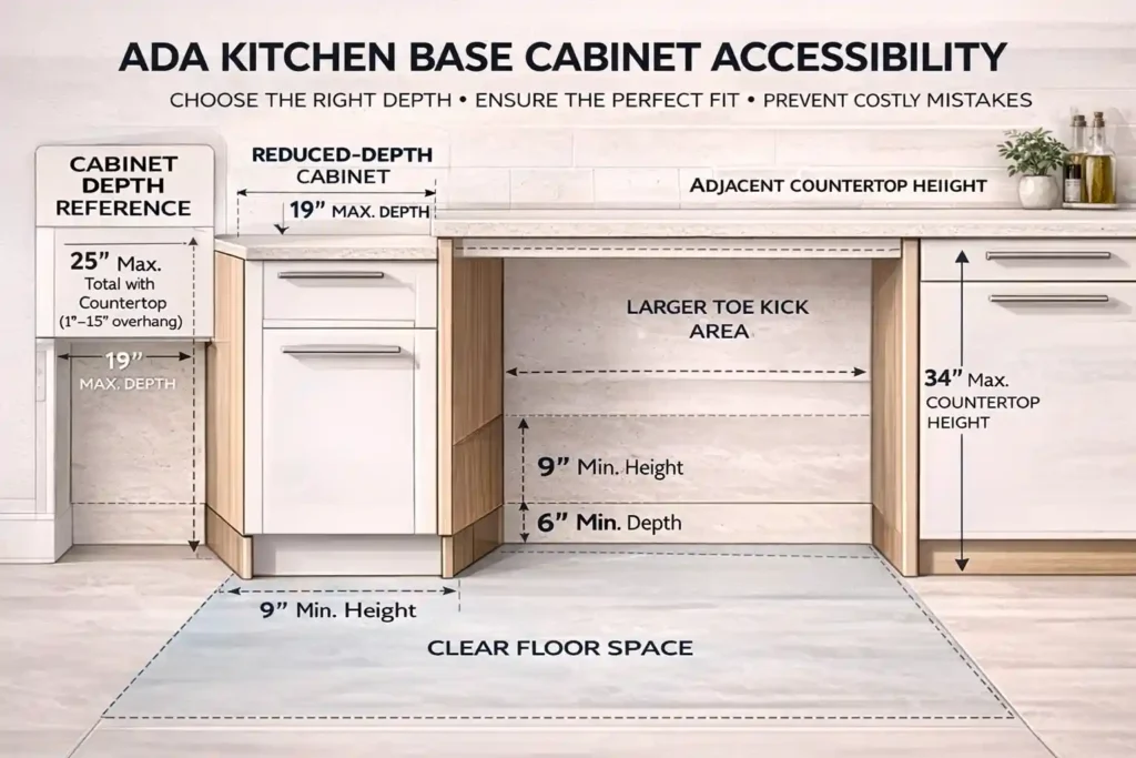 These requirements often mean one section of base cabinets is reduced to 18″ depth, leaving a knee-clearance zone beneath the counter. The flanking cabinets can remain 24″ standard depth.