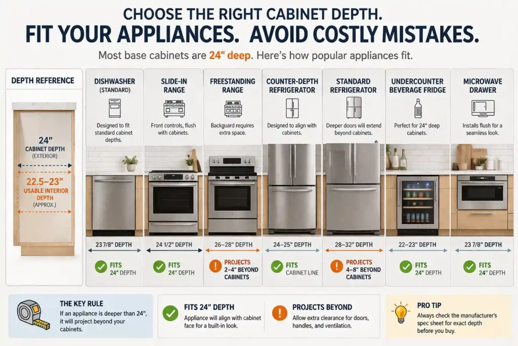 Measure your space at multiple points. Pull the spec sheets on your appliances before ordering cabinets. Think about who uses the kitchen, how they reach, and what you’re actually storing — then match the depth to those answers, not just to the catalog default.